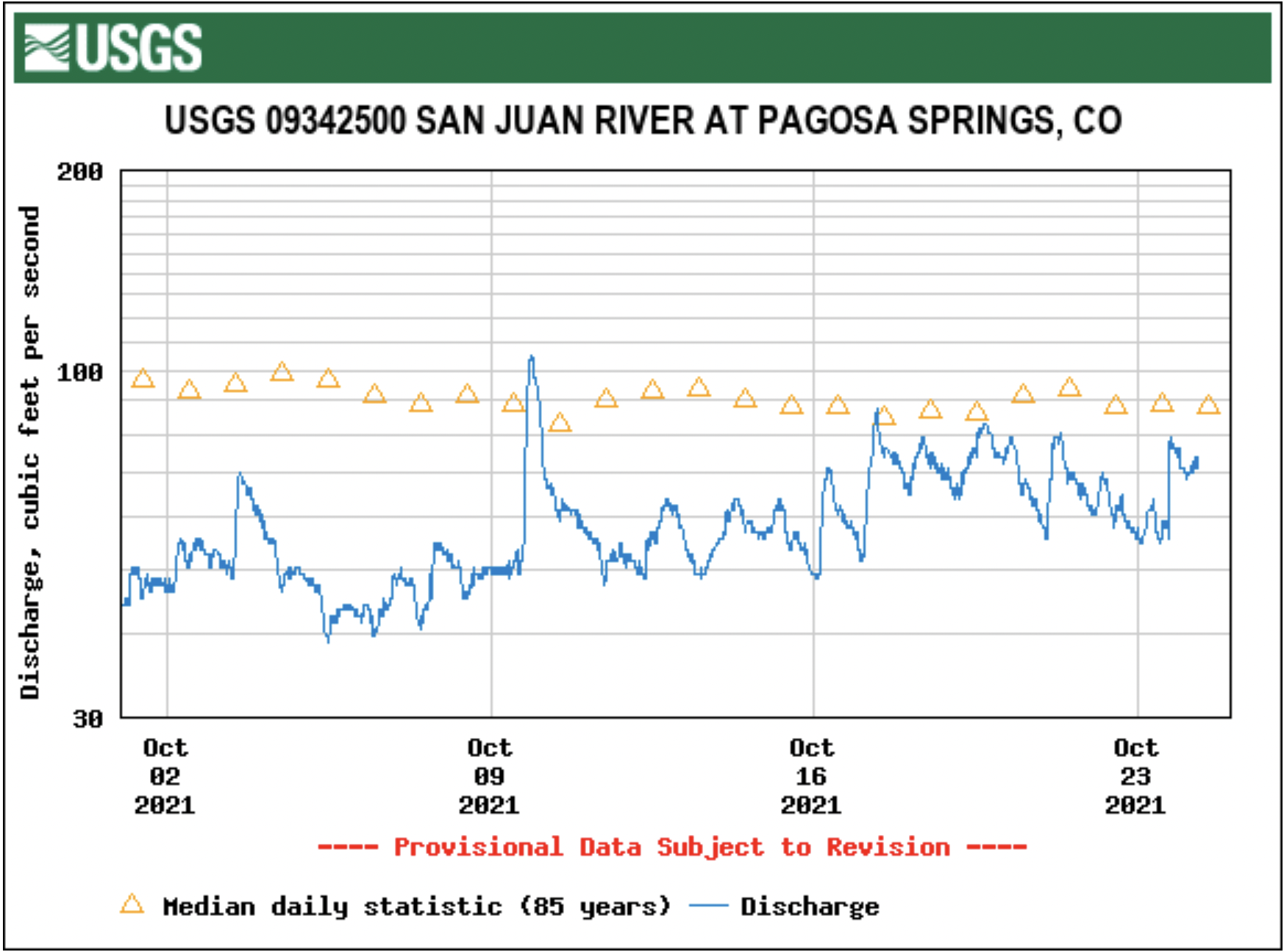 According to the U.S. Geological Survey (USGS), the San Juan River was flowing at a rate of 80.4 cfs in Pagosa Springs as of 10 a.m. Wednesday, Oct. 27.