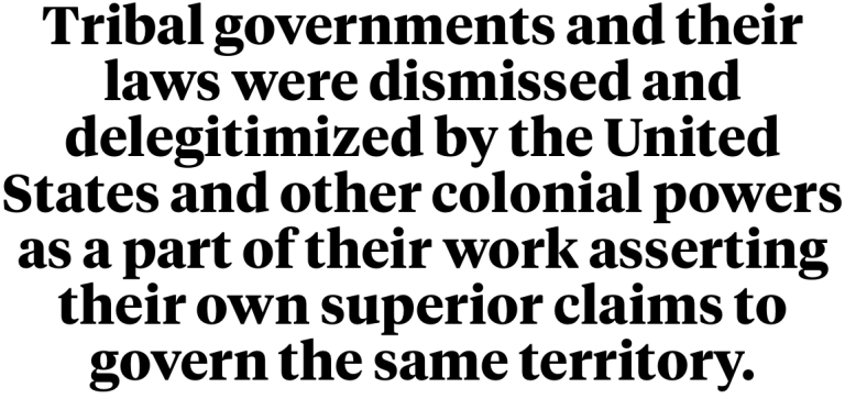 A difficult truth I struggled with in my recent article The Other American Law: how — even whether — to raise that tribal law was not marginalized by accident. Part of the colonial project involved making pre-existing government regimes look less worthy than the those that sought to displace them. Tribal governments and their laws were dismissed and delegitimized by the United States and other colonial powers as a part of their work asserting their own superior claims to govern the same territory.