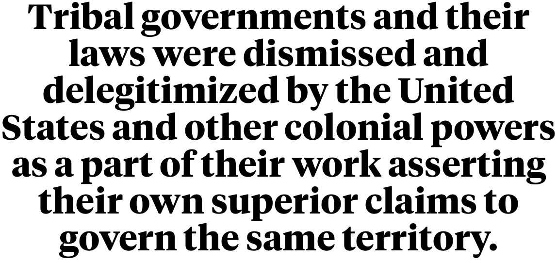 It’s an ugly truth. But it’s one that deeply colors how we see tribal governments and their laws. When most Americans imagine a pre-colonial “tribal government” we think small, familial and primitive. We imagine a “less evolved” version of Western societies that has nothing novel to offer us because our own ancestors have been there and done that already. What we did was equate differences with deficiencies and forget a fundamental truth that we’ve all been human for just as long, simply making different choices. A lot of knowledge was lost or destroyed as colonial powers steamrolled over what they dismissed or were willfully blind to.