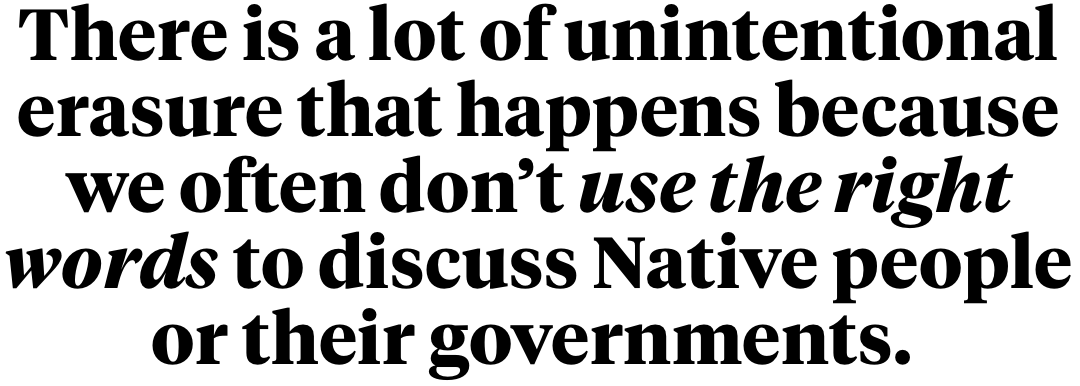There is a lot of unintentional erasure that happens because we often don’t use the right words to discuss Native people or their governments. A tip that I recommend is asking yourself if you substituted in more familiar group’s name in sentence, would it still make sense? If I want to use “Native American” or “American Indian,” I need to remember that I’m using a continent-wide term with as little real meaning for people’s identity or political groupings as other continent-wide terms like “Asian” or “European.”