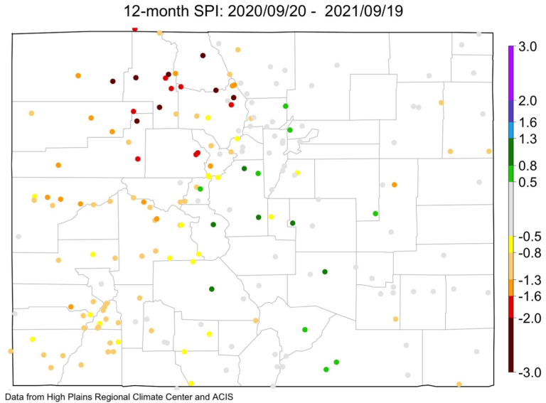 The Standardized Precipitation Index (SPI) values over varying timescales (30 days to 24 months) reveal varying chapters in the 2020-2021 drought story. Despite the summer monsoon activity that brought wetter conditions to western Colorado, the 12-month SPI shows extreme drought conditions in northwest Colorado and a continued dry pattern across the western half of the state. The satellite-derived VegDri Index, partially based on SPI, similarly highlights severe drought stress for vegetation in southeast Colorado and moderate drought on the eastern plains and northwest Colorado. Overall, there are very dry soil conditions going into the winter months.
