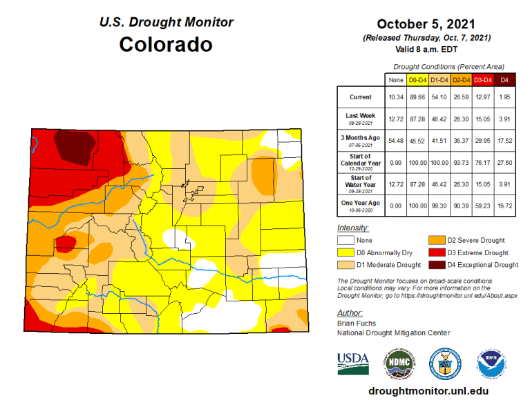 As the 2021 Water Year comes to a close, Colorado experienced the 4th warmest summer on record in 127 years on record. The month of August concluded as the 14th warmest August statewide and the 23rd driest on record. The U.S. Drought Monitor from October 5 reflects the result of warmer than average temperatures and below average precipitation as 2% of Colorado persists in exceptional (D4) conditions; 11% in extreme drought (D3); 14% severe drought (D2); 27% moderate (D1); and 35% of the state in abnormally dry (D0) conditions.