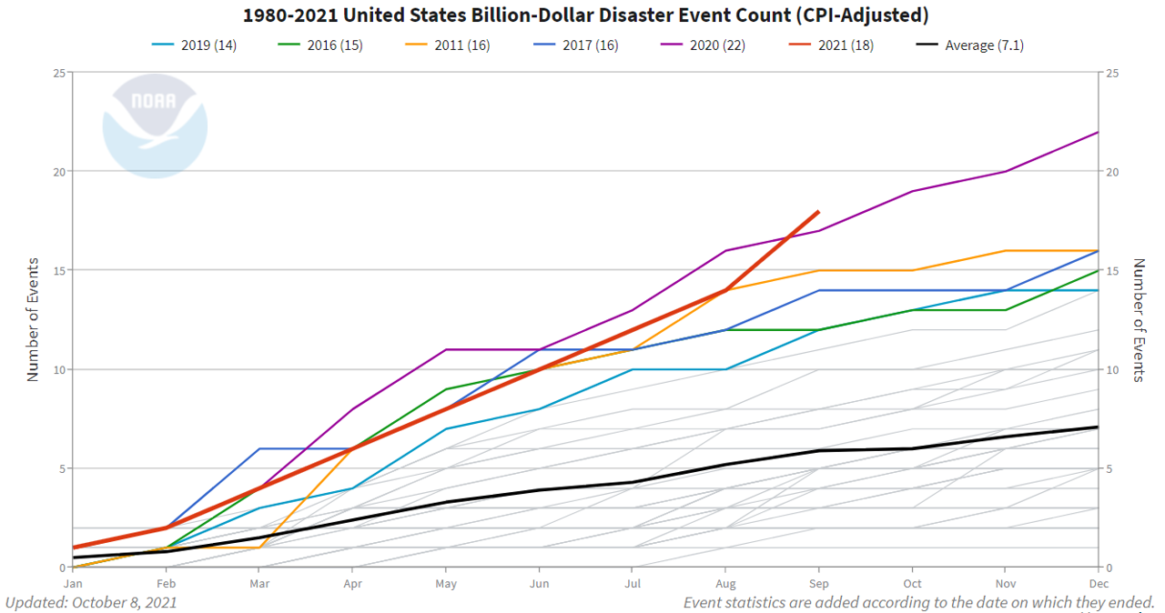 The first nine months of 2021 have tallied the largest number of disasters in a calendar year so far, with 2021 currently placing second behind 2020.