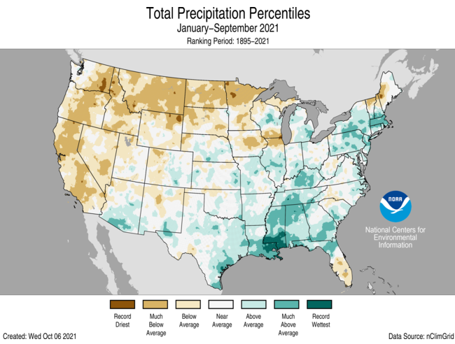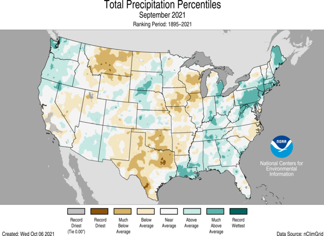Some extremes included Oklahoma, which had its ninth-driest September, as well as Pennsylvania and Massachusetts, which saw their seventh- and eighth-wettest Septembers on record respectively, due to the remnants of Hurricane Ida.
