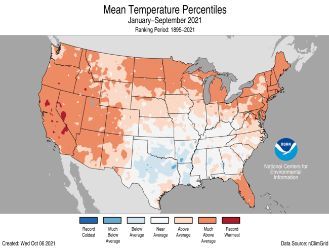 For September, the average contiguous U.S. temperature was 67.8°F, 3.0°F above the 20th-century average, the fifth-warmest September in the 127-year period of record. For the year-to-date, the contiguous U.S. temperature was 57.0°F, 1.9°F above the 20th-century average, ranking 10th warmest in the January-September record.