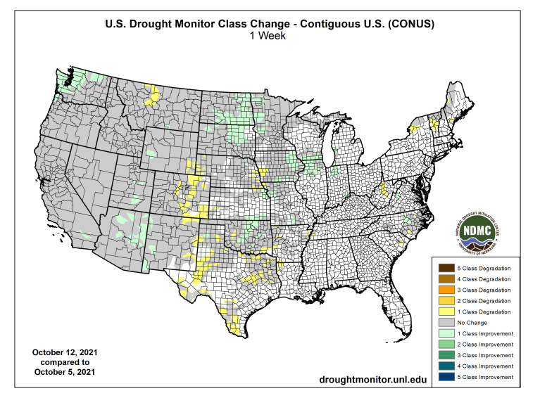 US Drought Monitor one week change map ending October 12, 2021.