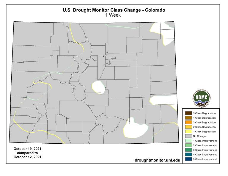 Colorado Drought Monitor one week change map ending October 19, 2021.