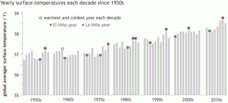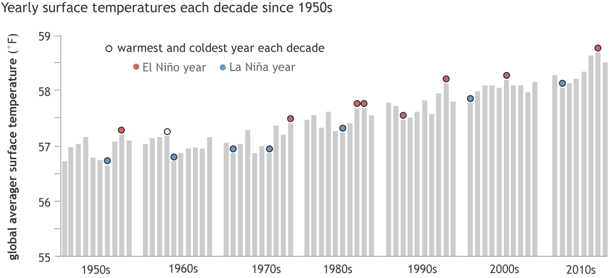 Annual global surface temperature (gray bars), grouped by decade, from 1950 to 2017. The warmest and coldest years of each decade are topped with circles: red for El Niño years and blue for La Niña years. El Niño/La Niña labels are based on the December-February anomaly of the Oceanic Niño Index. In general, the warmest year of any decade will be an El Niño year, the coldest a La Niña one. Only two decades seem to violate the general rule: the 1960s and the 1990s. By our definition, 1963 did not qualify as El Niño year because the December–February ONI value was neutral. However, El Niño did emerge later in the year, and it persisted for 7 months. The bigger surprise was 1992, which was the coldest year of the 1990s despite being an El Niño year. The 1991 eruption of Mount Pinatubo was likely to blame. Graphic by NOAA Climate.gov, based on data from NCEI.