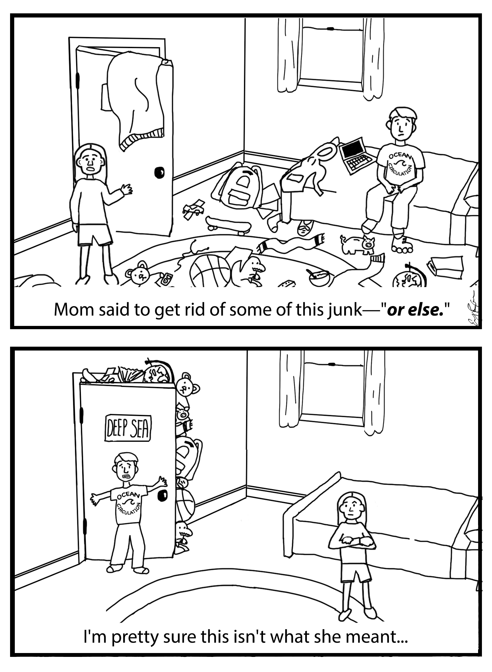 Like a room’s worth of mess stuffed into an overflowing closet, excess heat from carbon dioxide is being hidden in the ocean—thanks to its tremendous heat capacity and volume. NOAA Climate.gov cartoon by Emily Greenhalgh.