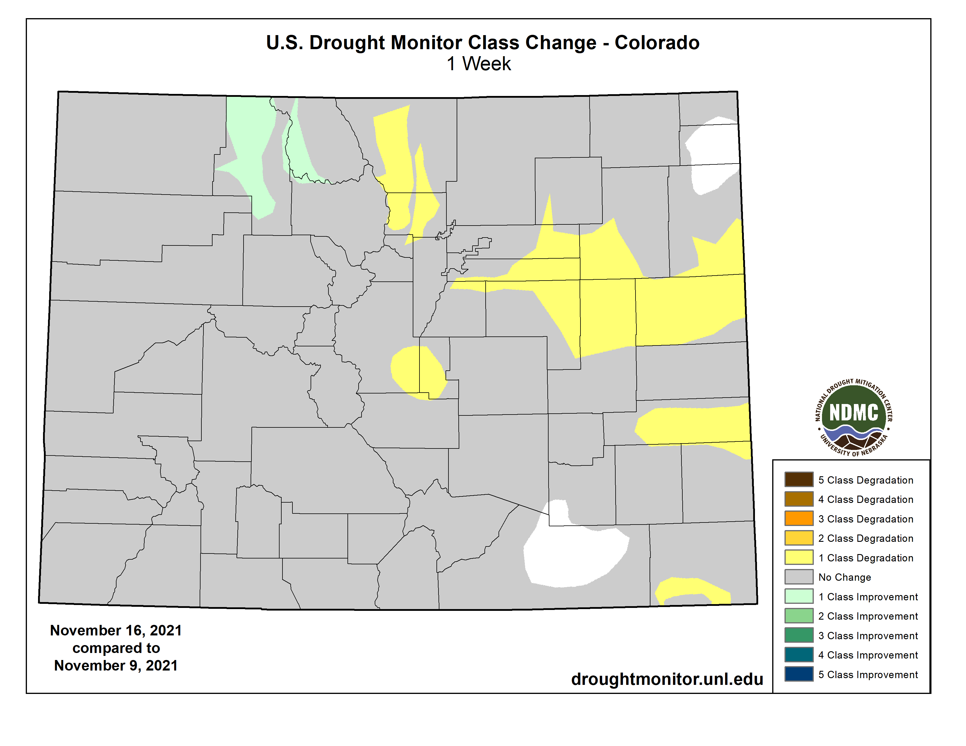 US Drought Monitor 1 week change map ending November 16, 2021.