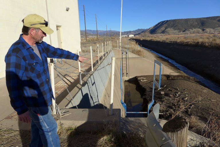 Nathan Bell, a consultant with the Silt Water Conservancy District points to the sediment built up where the canal that takes water from the Colorado River feeds into the pump house. An upstream water quality monitoring project, which received funding approval from the Colorado Basin Roundtable, could help alert the district when mudslides occur in Glenwood Canyon. CREDIT: HEATHER SACKETT/ASPEN JOURNALISM