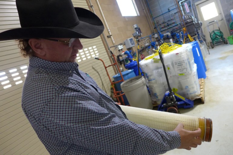 Town of Silt Public Works Director Trey Fonner points out how the water treatment plantās filters were affected by turbid water from the mudslides in Glenwood Canyon last summer. The town had to replace them at a cost of $48,000. CREDIT: HEATHER SACKETT/ASPEN JOURNALISM