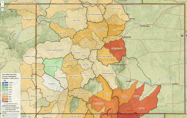 Overall, this meant that we gained about 20 percentage points of the snowpack that we should have by this time of the year. The most notable increases that you’ll find are near Telluride, Silverton and Durango, where past storms have really dropped some moisture. The Gunnison and Upper Rio Grande watersheds have also seen a great increase in snowpack numbers.