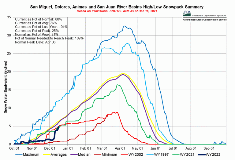 San Miguel, Dolores, Animas, and San Juan Basin High/Low graph December 16, 2021 via the NRCS.