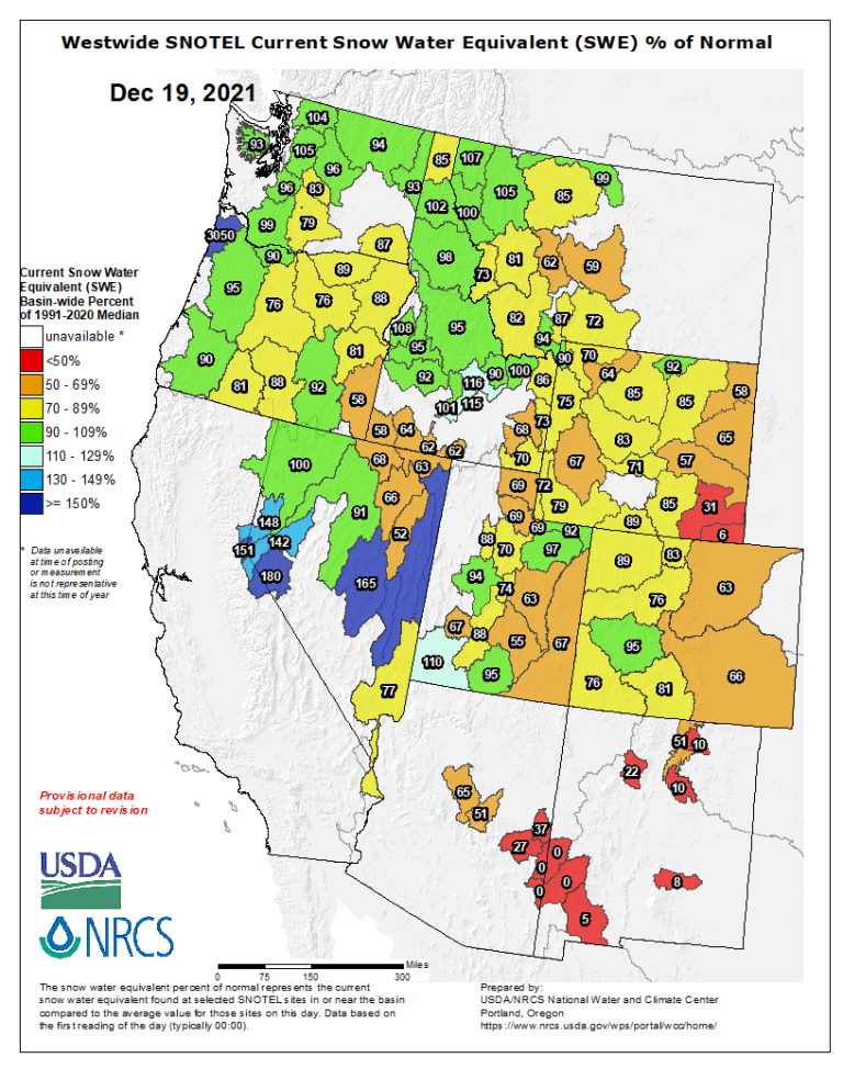 Westwide SNOTEL basin-filled map December 19, 2021 via the NRCS.