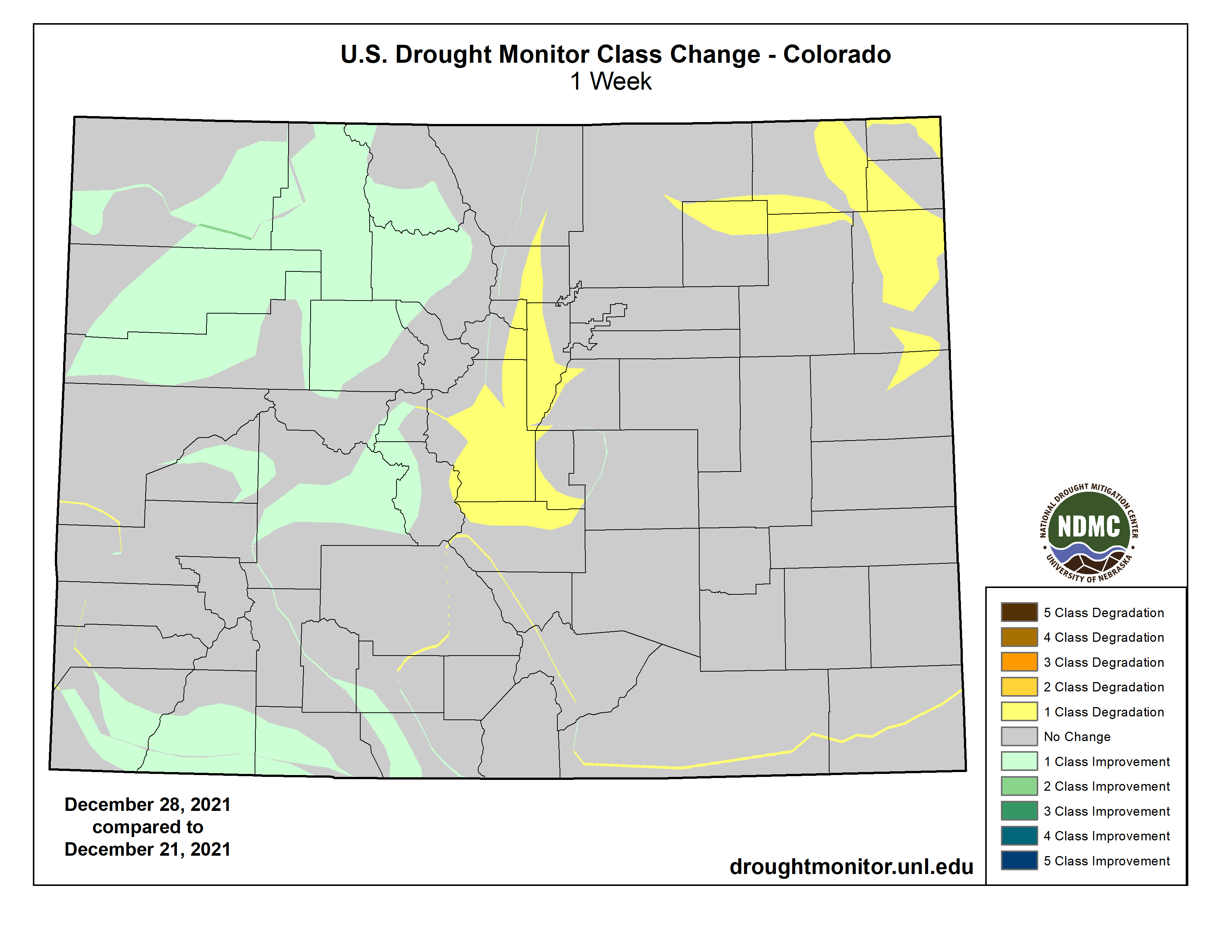 Colorado Drought Monitor one week change map ending December 28, 2021.