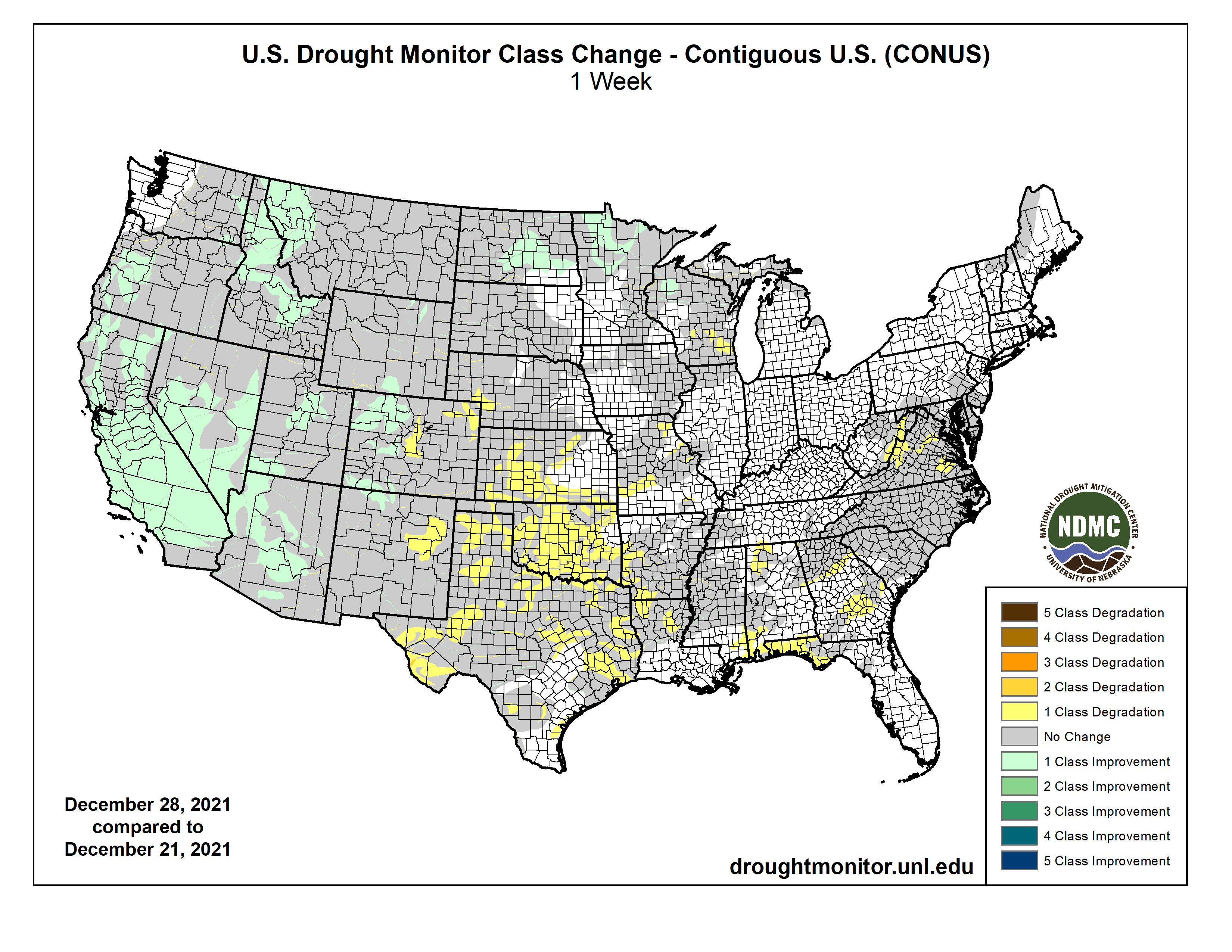 Based on persistent dryness, periods of enhanced winds and anomalous warmth this month, and worsening soil moisture conditions, a broad 1-category degradation was made to much of Oklahoma and the Texas Panhandle. Most locations across southwestern Oklahoma along with the Oklahoma and Texas Panhandles have received less than 0.10 inch of precipitation during the past 70 to 80 days. As of December 28, Amarillo, Texas has observed no precipitation for 76 consecutive days which is the second longest dry streak on record. Additional expansion of various Dx levels was also made across much of the remainder of Texas due to persistent dryness and much above normal temperatures. Month-to-date temperatures, as of December 28, have averaged more than 8 degrees F above normal throughout nearly all of Oklahoma and Texas. The current depiction of conditions across Arkansas, Louisiana, and Mississippi was a balance among SPI values, soil moisture, and 28-day average streamflows. During the past 90 days, precipitation has averaged less than 50 percent of normal throughout much of the lower Mississippi Valley…