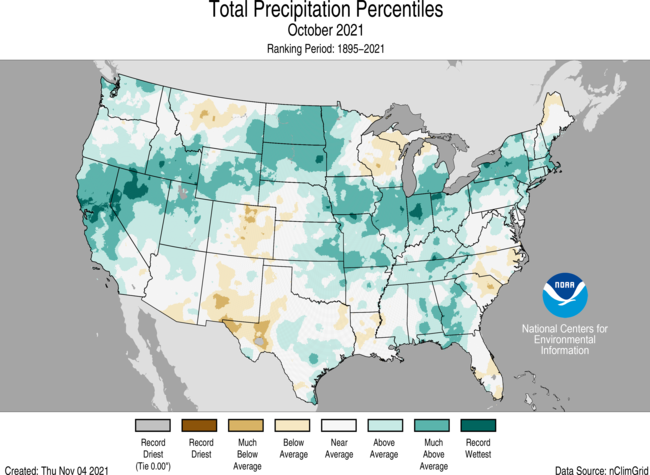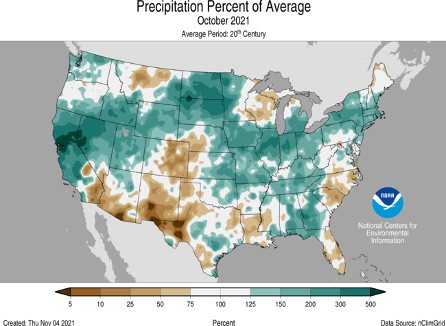 The Climate Prediction Center’s 6 – 10-day outlook (valid November 16– 19) favors an active storm track across the northern tier of the Lower 48. This pattern would bring above-normal rainfall to the Pacific Northwest eastward to the Upper Midwest. Below-normal precipitation is likely across the southern tier of the Lower 48, with the greatest odds (more than 50%) over parts of the Southwest, the Southeast, and Alaska. The highest odds for above-normal temperatures occur in the Southwest (greater than 70%). Odds of above-normal temperatures decrease moving northward. The highest odds for below-normal temperatures occur in the Southeast (greater than 60%). Odds of below-normal temperatures decrease across the South and Midwest.