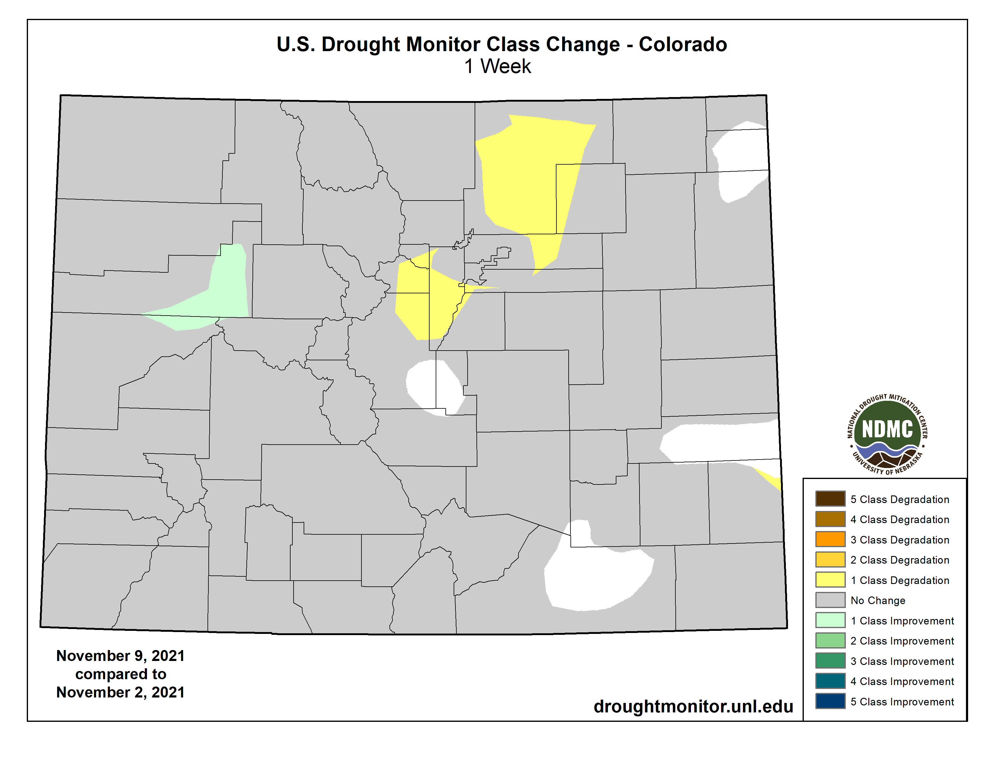 Colorado Drought Monitor one week change map week ending November 9, 2021.