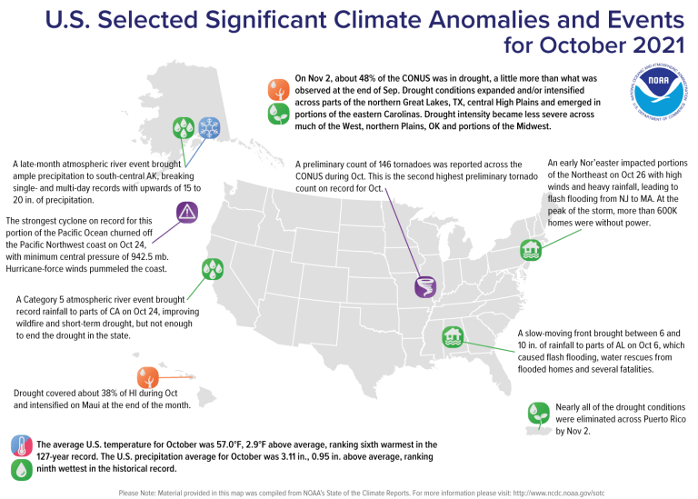 Along the Pacific Coast, near or slightly below normal temperatures combined with heavy precipitation (which exceeded 5 inches in some areas) to improve drought conditions in parts of northern California, southwest Oregon, and Washington. In central Utah, groundwater conditions and long-term precipitation deficits had improved enough for some of the exceptional drought to improve to extreme drought. In Montana, much of the eastern part of the state remained dry, leading to some expansion in exceptional drought, where multiple short- and long-term datasets indicate worsening conditions. In western Montana, a small part of exceptional drought improved to extreme drought where short- and long-term precipitation deficits had improved. In small parts of western Colorado and south-central Wyoming, streamflow and precipitation deficits had decreased enough to lead to improving drought conditions. Farther east in Colorado, recent warm temperatures combined with dry weather to lead to worsening drought conditions in a few areas. Finally, moderate drought expanded in eastern New Mexico, where short-term dry weather combined with depleted soil moisture to lead to worsening conditions. In Oregon and California, long-term drought conditions have adversely affected salmon populations and migratory birds. Due to widespread recent precipitation, much of the West region is now experiencing long-term drought, rather than both short- and long-term drought…