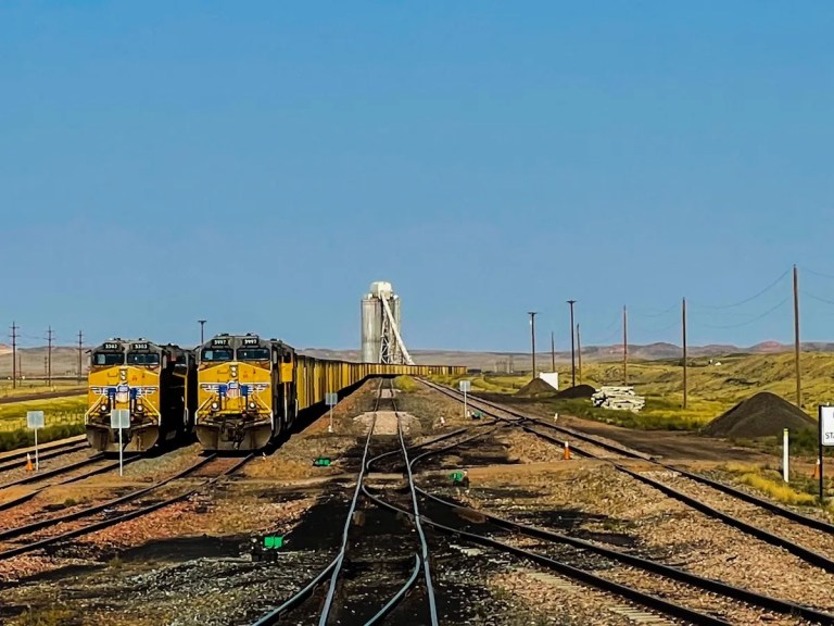 A pair of coal trains idle at a switchyard near a coal loadout facility in northeast Wyoming. (Alan Nash/WyoFile)