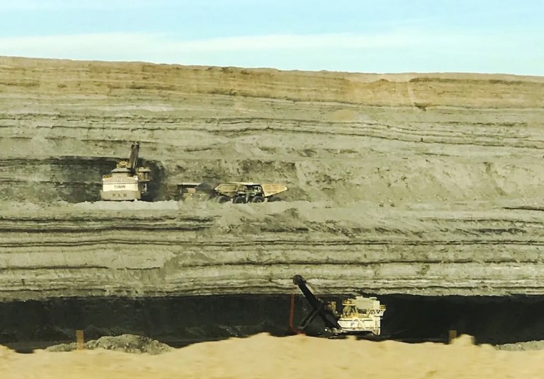 A truck-and-shovel crew removes overburden at the North Antelope Rochelle mine in Wyoming’s Powder River Basin in January 2020, as a coal shovel works below. (Alan Nash/WyoFile)