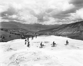 The Buffalo Soldiers of the 25th Infantry Regiment Bicycle Corps walk their cycles up Minerva Terrace, Mammoth Hot Springs, Yellowstone National Park. Photo by F. Jay Haynes, 1896. Montana Historical Society Research Center, Haynes Foundation Photograph Collection, H-3615. Used with permission from the Montana Historical Society.