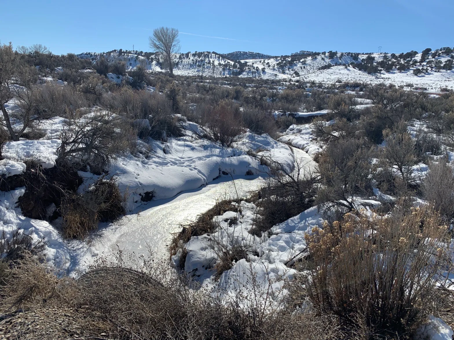 Dry Hollow Creek winds its way through fields near Silt. The Schatz Ditch pulls water from Dry Hollow Creek. CREDIT: HEATHER SACKETT/ASPEN JOURNALISM