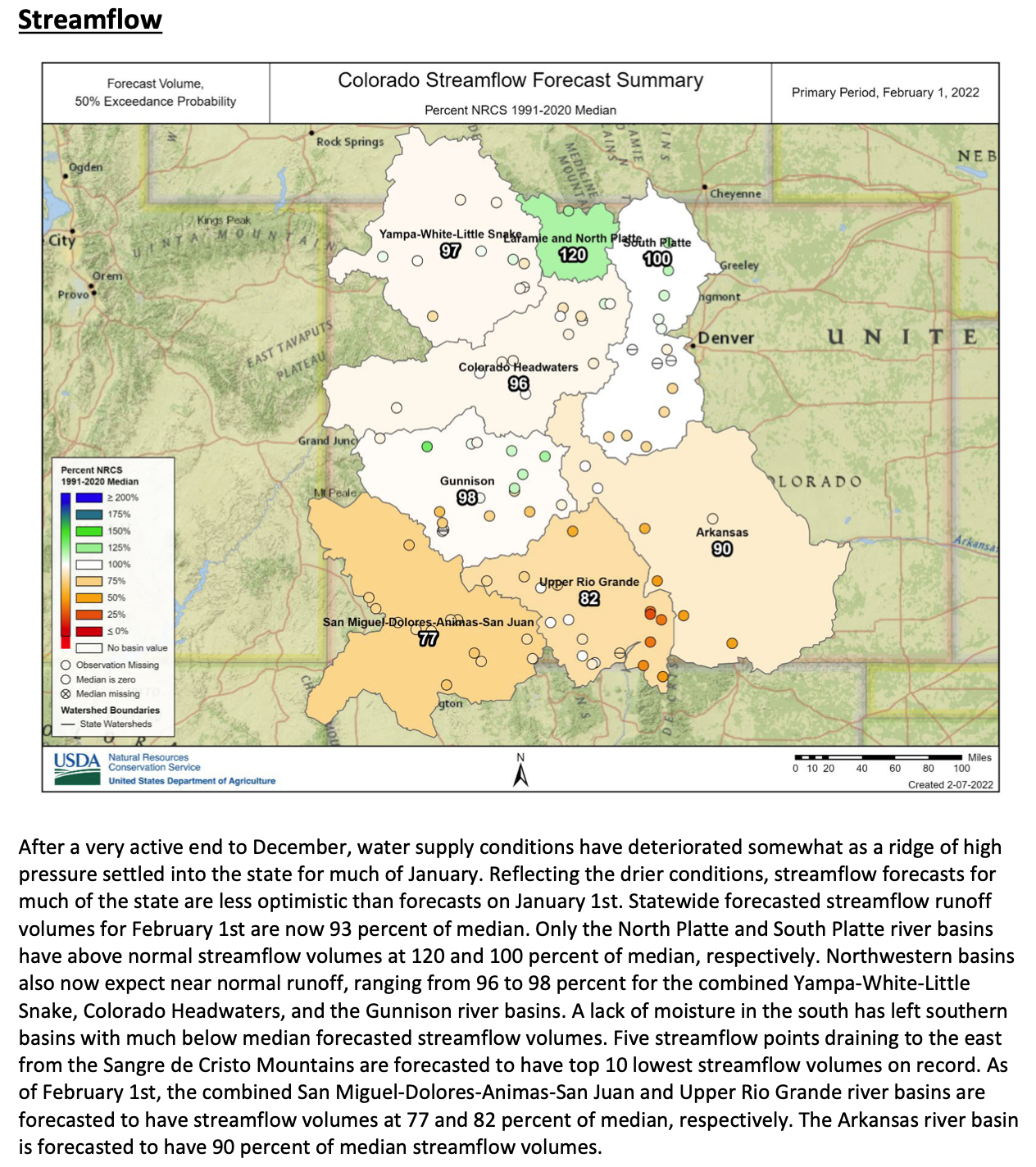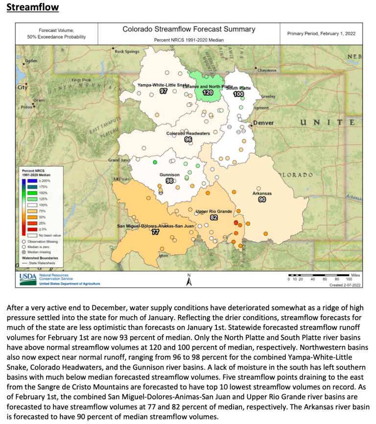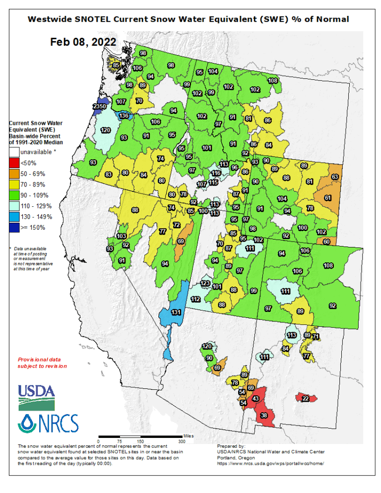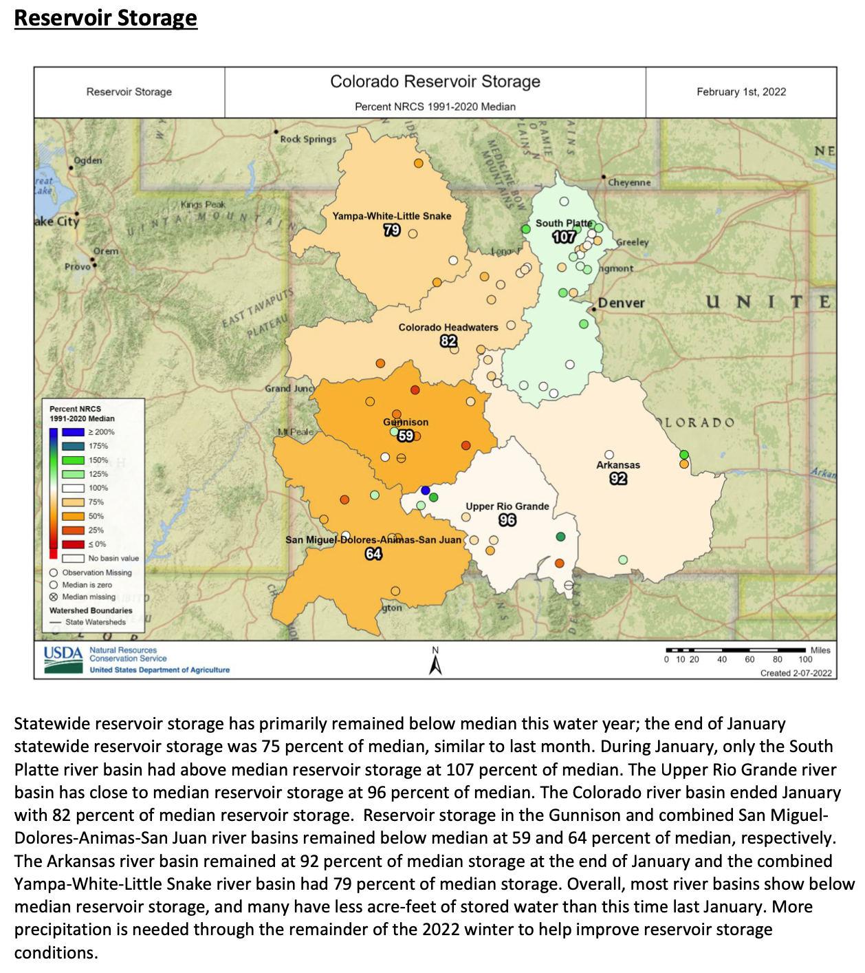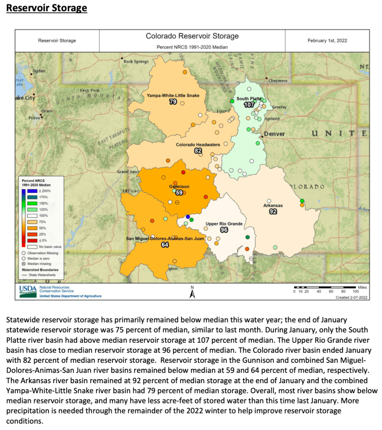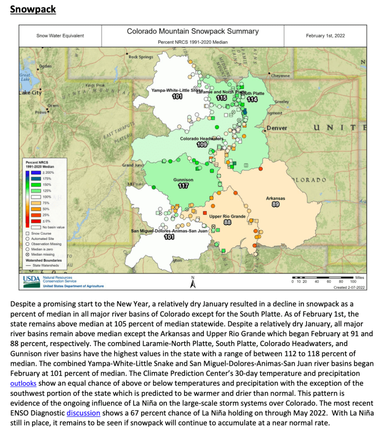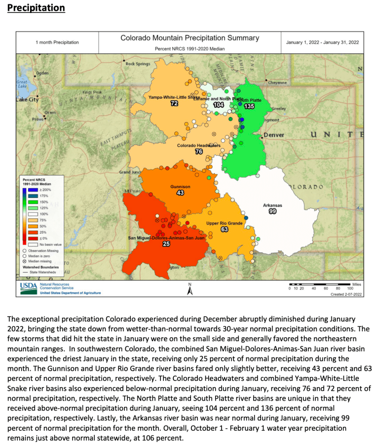 Snowpack across Colorado is overall good, but these numbers are down a good bit from where they were a month ago when snowpack statewide was nearing 130% of normal. While we’ve lost a good deal of snow with the mild and dry weather in the mountains, the big storms we saw around the holidays gave us a great cushion. However, that cushion has been almost completely eradicated, so it’s about time for us to get some snow back up there.