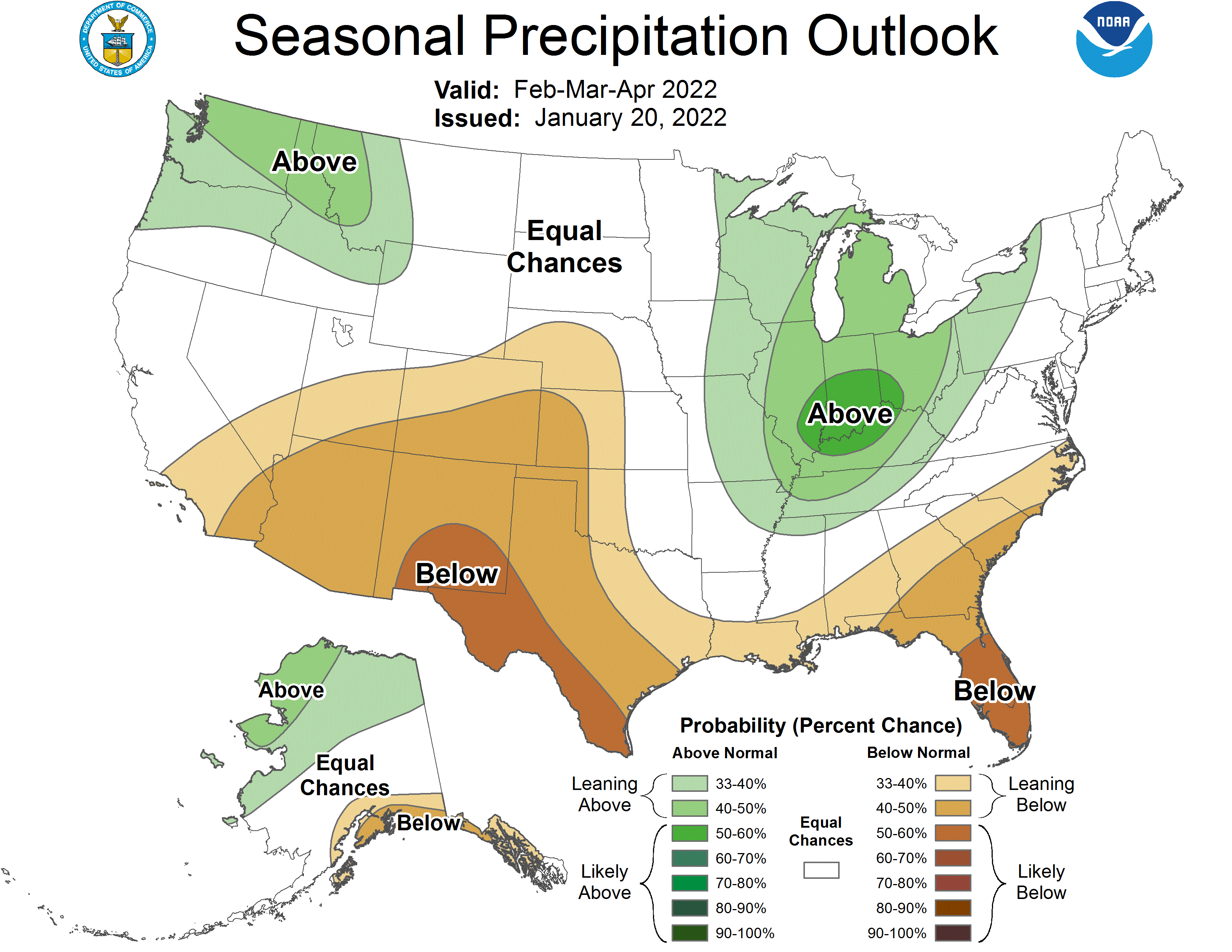 La Niña conditions remain in place over the eastern Pacific Ocean with ocean temperatures running 0.5-1º C below normal. La Niña conditions are expected to continue through April-May. A typical La Niña weather pattern, with wetter and cooler weather in the Northwest and warmer and drier weather in the Southwest, is forecasted to dominate the western United States through April. NOAA seasonal forecasts for February-April forecast an increased probability of above average temperature and below average precipitation for much of Colorado and Utah.