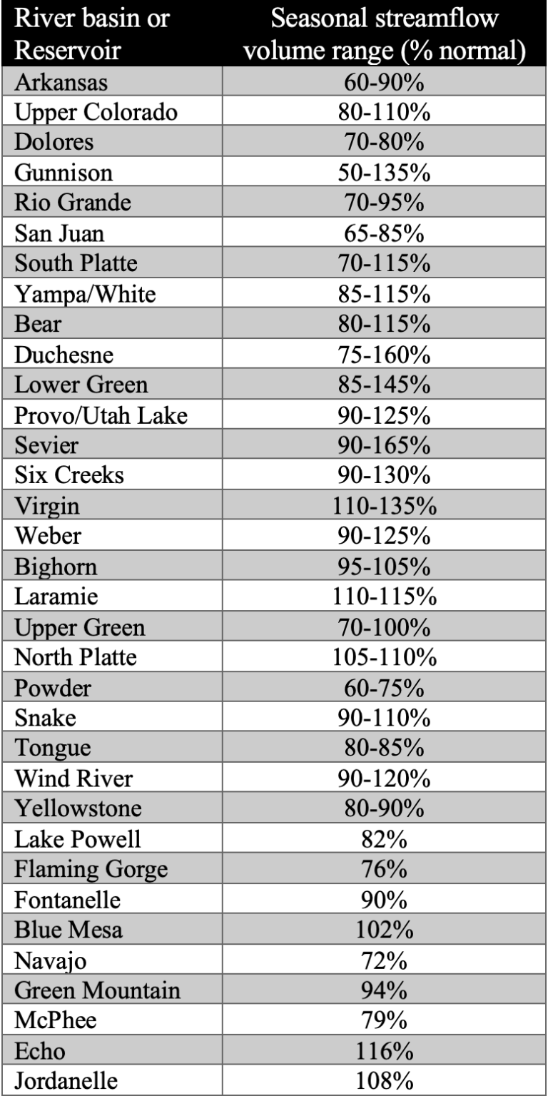 Dry conditions during January resulted in a decrease in seasonal streamflow forecasts relative to average except in the Bear, Upper Green, South Platte and Wind River Basins. Near-average streamflow volumes are forecasted for the Mainstem of the Colorado, Laramie, North Platte, Provo, Six Creeks, Upper Snake, South Platte, Weber and Upper Yampa River Basins. Above average streamflow is forecasted for the Virgin River Basin. Most other regional river basins are forecasted to see below normal seasonal streamflow volumes, with the Arkansas, Dolores, Powder and San Juan River Basins forecasted to see the lowest flows.