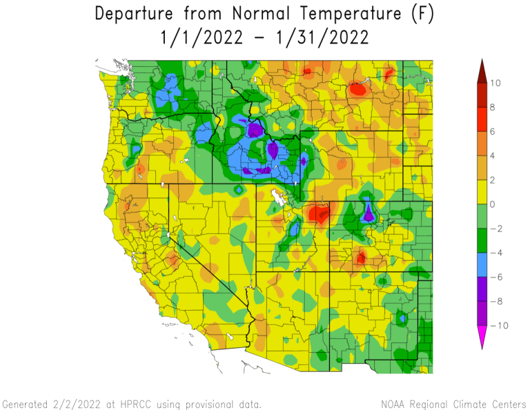 Temperatures were near average (+/- 2 degrees) for much of the region. Warmer than average January temperatures were observed in the Uintah Basin in Utah and west-central Wyoming. Below average temperatures were observed in western Wyoming, northern Colorado and eastern Colorado.