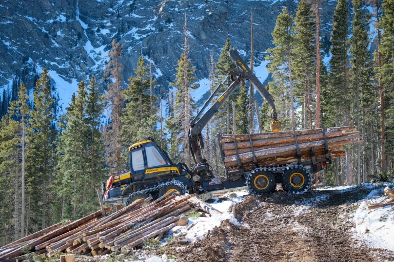 Agile equipment gathers processed logs in the forest and takes them to the road and stacks them. Photo credit: Ryan Michelle Scavo