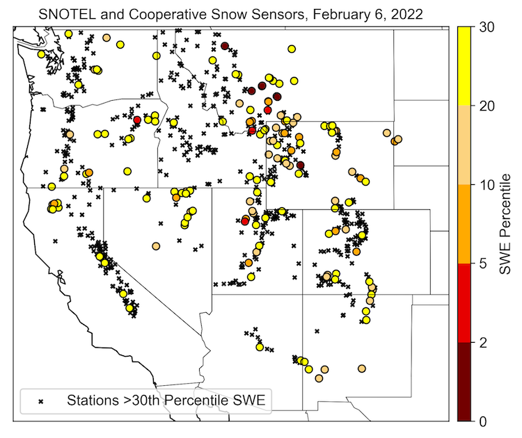 Snow water equivalent (SWE) percentiles for locations in the western U.S. at or below the 30th percentile as of February 6, 2022. Stations above the 30th percentile* are shown with a black āxā. Only SNOTEL and other Cooperative Snow Sensor stations with at least 20 years of data were used. Data Source: USDA Natural Resources Conservation Service.