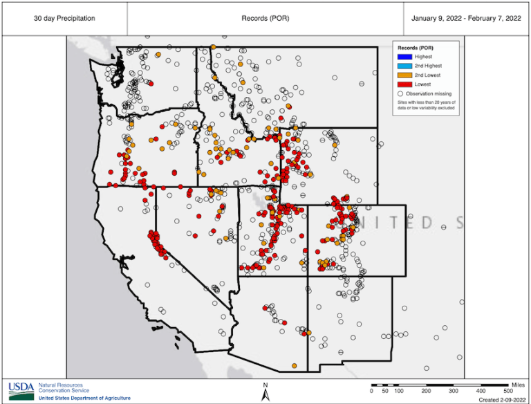 The faucet has been shut off across much of the West over the past month after a promising wet and snowy start to the season. Well above-normal snow water equivalent (SWE) at the start of 2022 provided the buffer needed to mitigate the extreme dry spell over the past month and avoid a rapid plunge into a snow drought across most of the region. A persistent ridge of high pressure has been parked off the West Coast since early January, leading to record-low precipitation totals at SNOTEL sites over the past 30 days in every western state except for New Mexico. Zero precipitation was observed over the past 30 days at many SNOTEL sites in northwest California, the Sierra Nevada, and the Great Basin. Remarkably, some of the sites at which zero snow fell in the past month still have slightly above-normal SWE thanks to major storms during the last two weeks of December and beginning of January. Still, the West as a whole is trending toward snow drought conditions, with below-normal SWE at 62% of the SNOTEL sites on February 8 compared to 21% on January 10