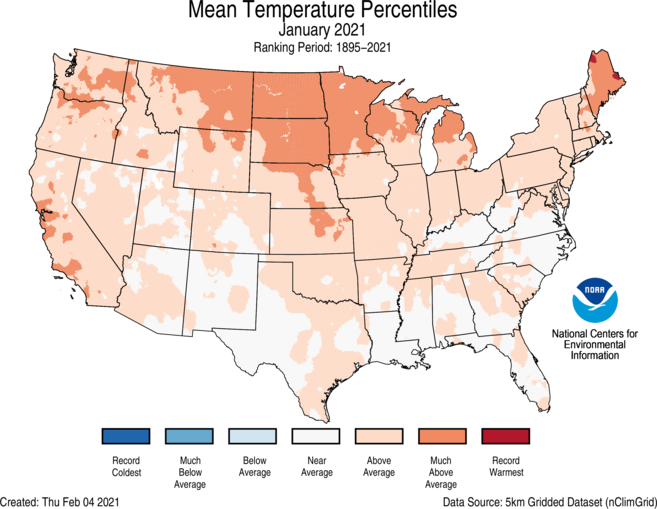 During January, the average contiguous U.S. temperature was 34.6°F, 4.5°F above the 20th-century average, tying for ninth-warmest January in the 127-year record. This was the 10th consecutive January with temperatures at least nominally above the 20th-century average for the month.