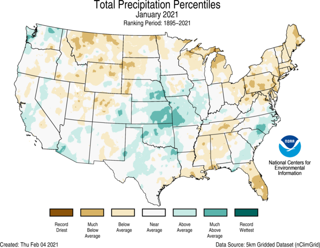 During January, above-average wetness was observed across portions of the West Coast, central and southern Plains and parts of the Southeast.