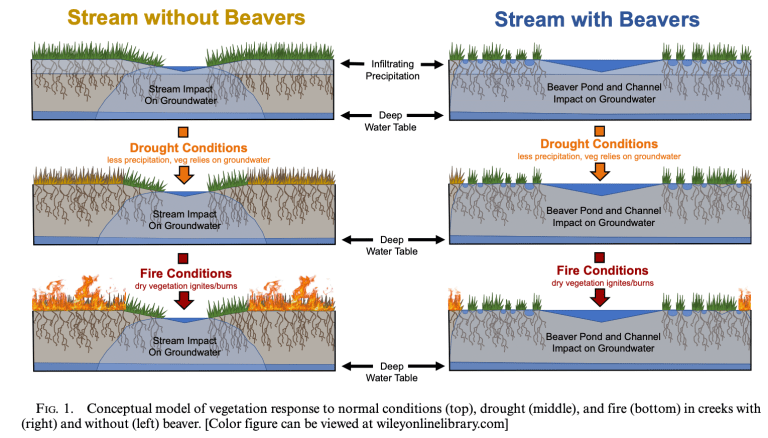 Conceptual model of vegetation response to normal, drought, and fire with and without beaver. Credit: ESA