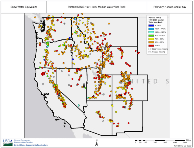 Percentage of median water year peak snow water equivalent (SWE) observed at SNOTEL and Cooperative Snow Sensors as of February 7, 2022. SWE values at many locations are below 50% of the median peak SWE (shown in red). A few locations in the Pacific Northwest already have SWE values that exceed the median peak SWE (shown in cyan and blue). Data Source: USDA Natural Resources Conservation Service.