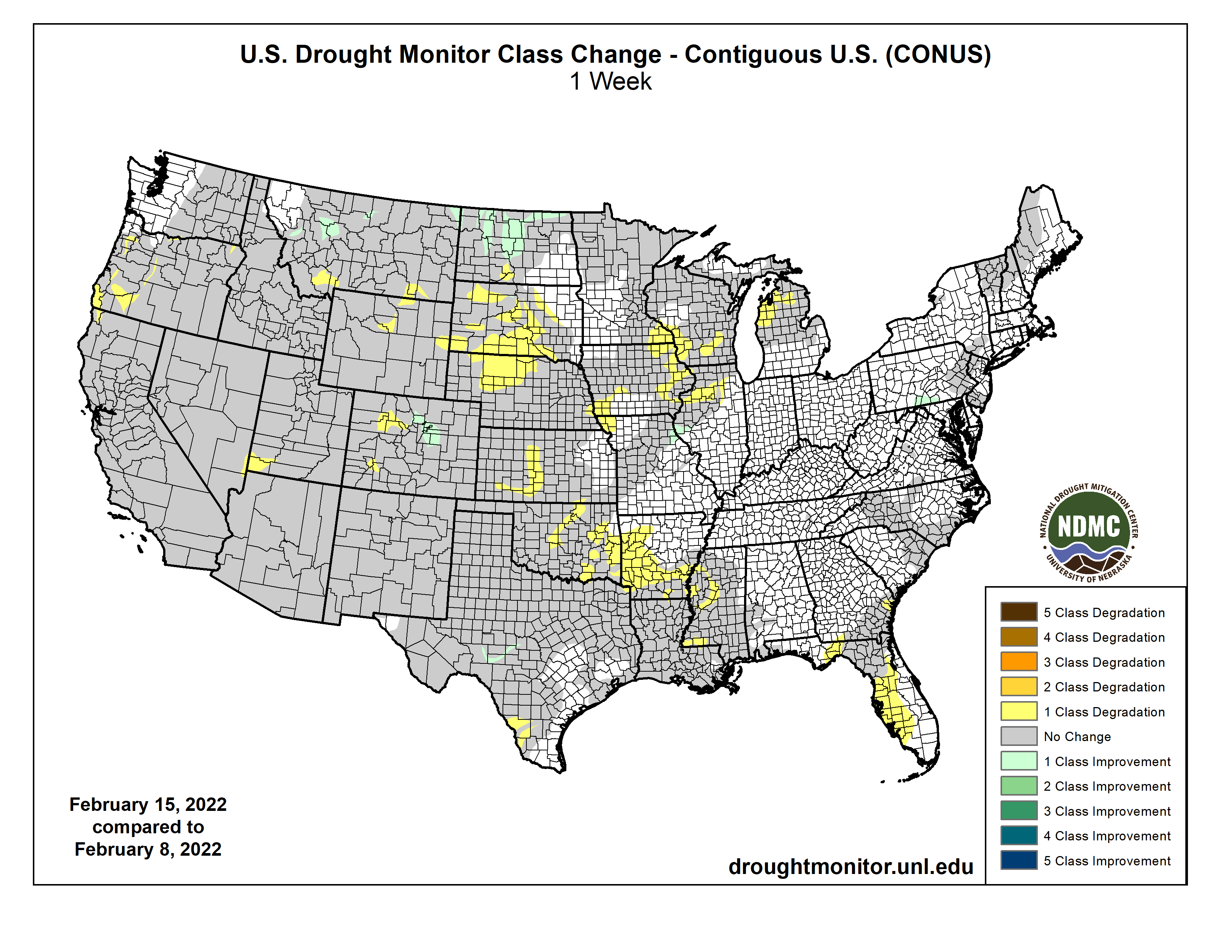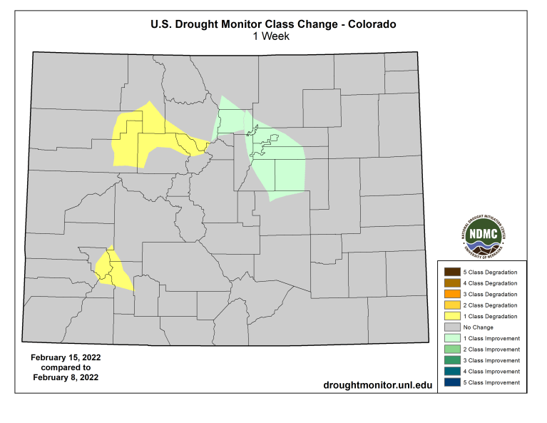 Colorado Drought Monitor one week change map ending February 15, 2022.