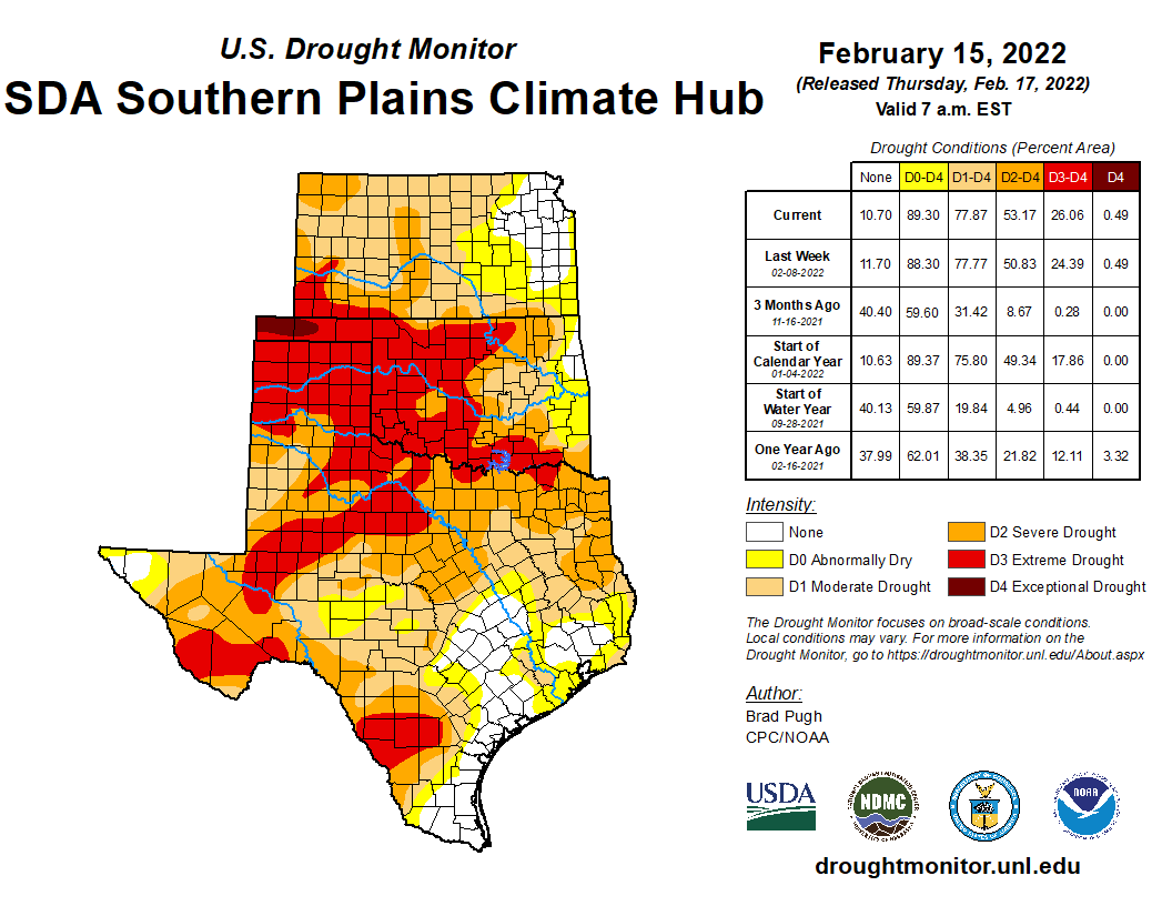 Based on 90-day SPI values and soil moisture indicators, a 1-category degradation was made to parts of Arkansas and adjacent northwest Mississippi. Impacts related to these worsening drought conditions include dry ponds and continued high fire danger. The previous week’s D2 areas in southwest Mississippi and adjacent Louisiana were merged and slightly expanded eastward, consistent with SPoRT soil moisture percentiles, 28-day average streamflows, and 90-day SPI values. Precipitation deficits of more than 8 inches are observed during the past 90 days across a broad area of the Lower Mississippi Valley. Statewide precipitation across Mississippi during November-December-January was the driest since 1985/86. On February 15, a statewide burn ban was issued for Louisiana. An expansion of extreme drought (D3) was made across north-central Oklahoma, based on 90-day SPI and worsening soil moisture indicators. Persistent dryness along with periods of above normal temperatures and enhanced winds this winter prompted an expansion of severe to extreme drought (D2 to D3 ) across the middle Rio Grande Valley. Despite a dry week, a reassessment of SPI values at various time scales and soil moisture indicators supported a 1-category improvement from moderate drought (D1) to abnormal dryness (D0) across the southern Edwards Plateau. According to the USDA’s National Agricultural Statistics Service, 77 percent of the topsoil moisture was rated as poor to very poor across Texas as of February 13. Nearly two-thirds of oats, winter wheat, and rangeland and pastures were rated in poor to very poor condition…
