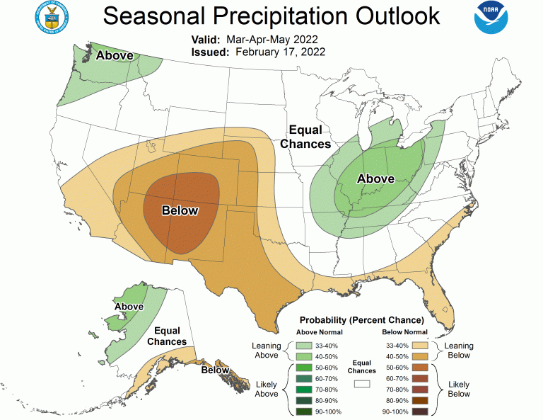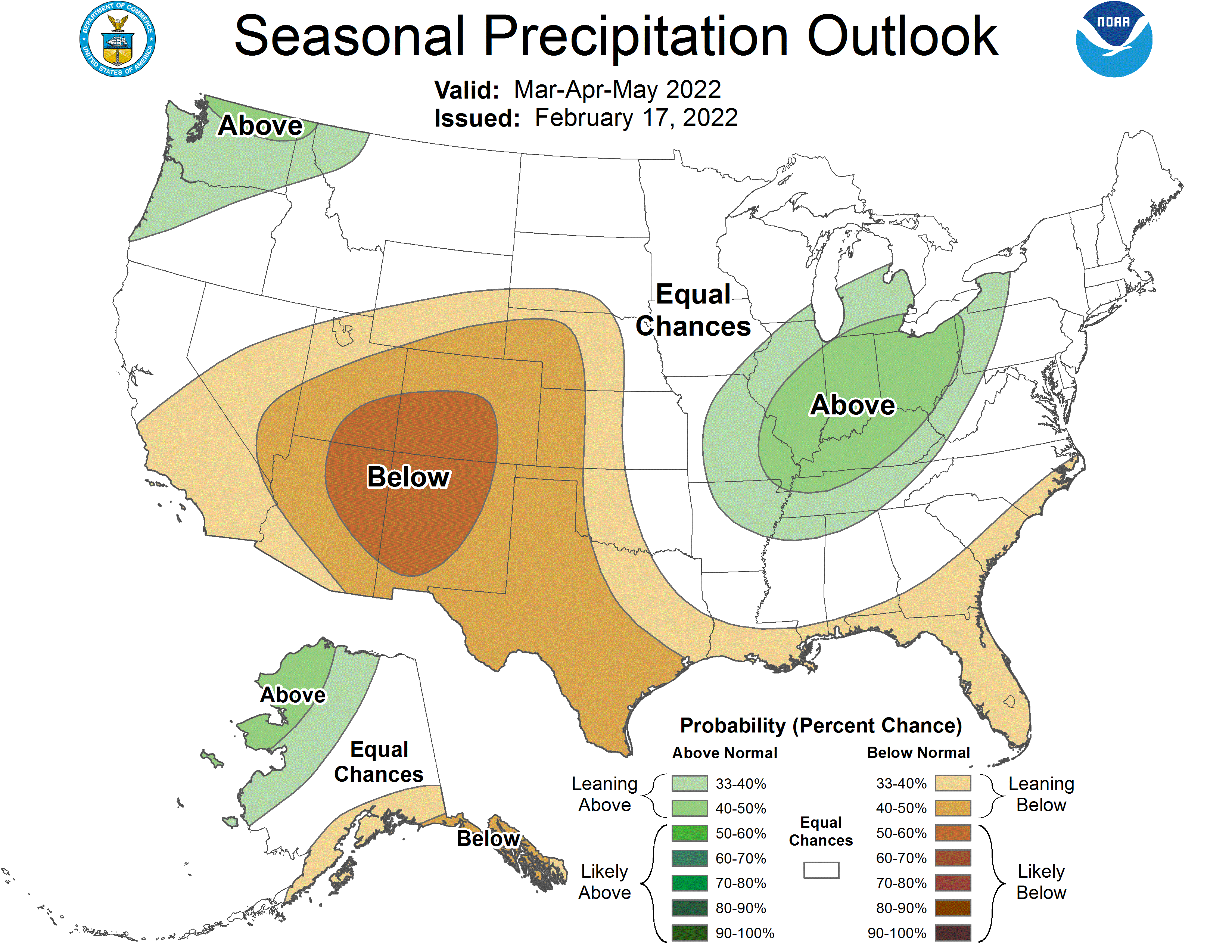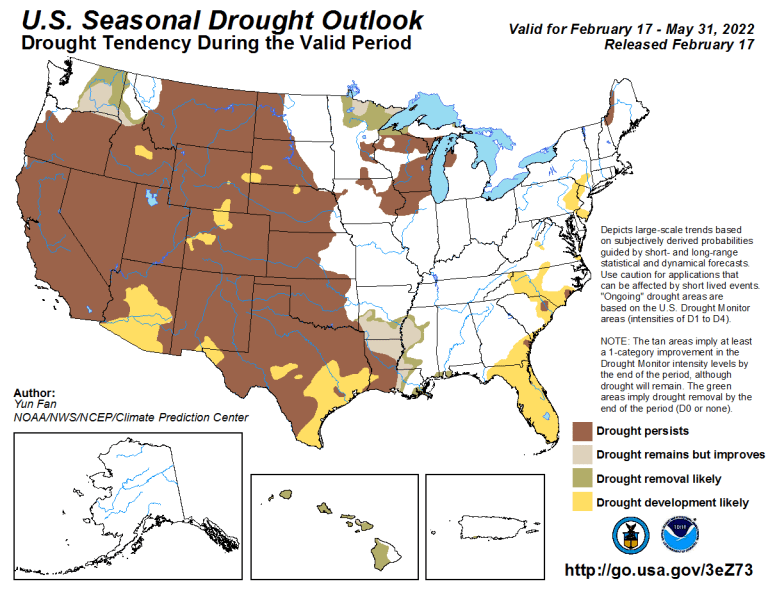The Climate Prediction Center’s 6-10 day outlook (valid Feb 22-26, 2022) depicts a major pattern change over the West and north-central U.S. from earlier in the month. Large probabilities (more than 70 percent) of below normal temperatures are forecast throughout the West and much of the Great Plains. Conversely, large probabilities (more than 70 percent) of above normal temperatures are forecast across the Mid-Atlantic and Southeast. Below-normal precipitation is favored for the Pacific Northwest, Great Basin, California, and Florida. A storm track, consistent with La Nina, elevates probabilities for above normal precipitation across the Ohio and Tennessee Valleys.