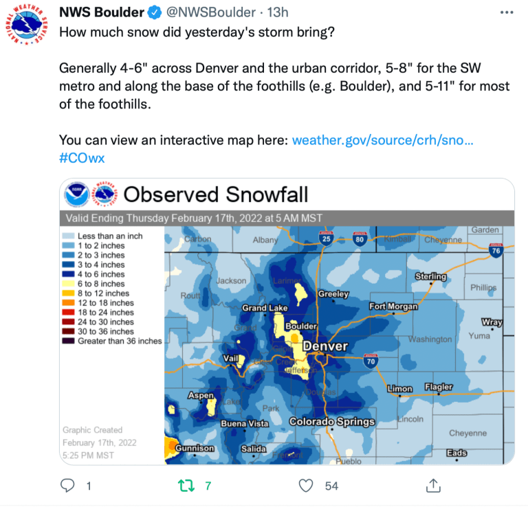 Fort Collins generally received 4 to 5 inches of snow, with one reporting station 5.4 miles west-southwest of the city’s main reporting station on the Colorado State University campus reporting 6.5 inches, according to the weather service and Community Collaborative Rain, Hail and Snow Network stations…