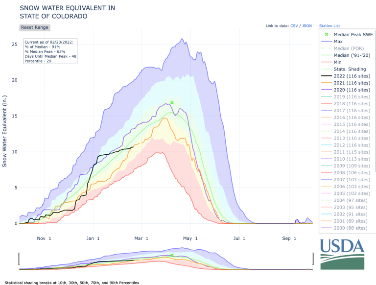 As a result of continued dry conditions year-over-year, hydrologists have noted that above-average snowpack is now necessary in order to see stream flows closer to “normal,” since increased temperatures and less moisture overall means dryer soil, which means less runoff making its way into the surface water. “Dry soil conditions going into winter can reduce the observed streamflow relative to what the observed peak snowpack ends up being,” said NRCS Hydrologist Karl Wetlaufer.
