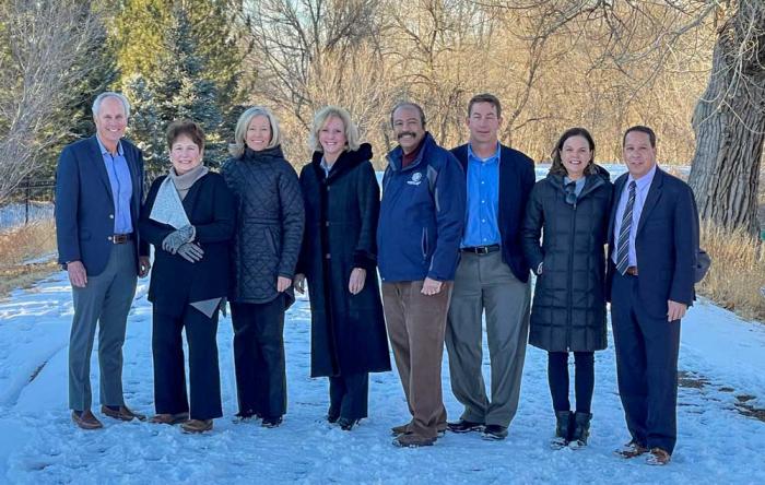 Several members of the newly formed Canal Collaborative gathered along the High Line Canal on Jan. 26, to celebrate the signing of the landmark partnership. Left to right in the picture above are: Jim Lochhead, Denver Water CEO/Manager; Paula Herzmark, HLCC board chair; Harriet Crittenden LaMair, HLCC executive director; Nancy Sharpe, Arapahoe County Commissioner; Shannon Carter, Arapahoe County Open Spaces director; Tom Roode, head of Denver Water operations and maintenance; Kendra Black, Denver City Councilwoman; Scott Gilmore, deputy executive director of Denver Parks and Recreation. Photo credit: Denver Water. Photo credit: Denver Water.