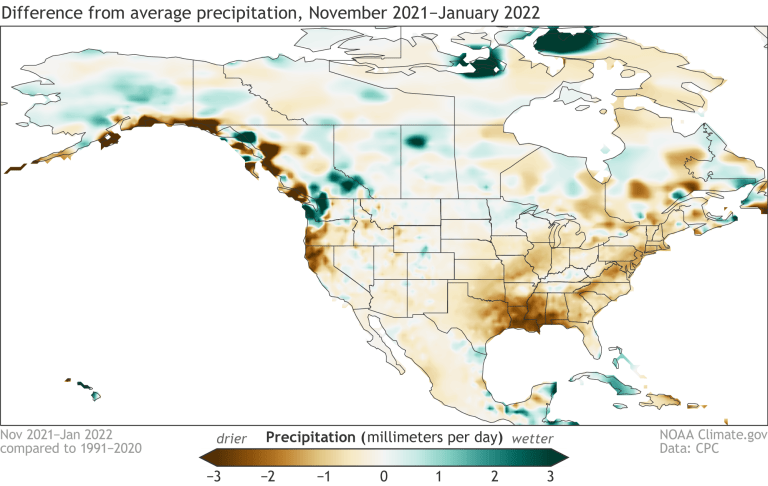 Precipitation difference from the 1991ā2020 long-term average during November 2021āJanuary 2022. Precipitation is rain plus the liquid equivalent of snow and ice. Map by climate.gov from CPC Global Daily Precipitation data.