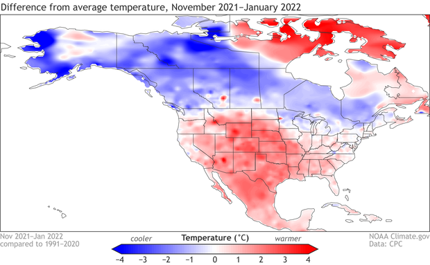 The NovemberāJanuary average temperature ended up looking a lot like what weād expect during La NiƱa: colder than average through Canada, warmer over most of the US. Not exactly the same, but reasonably similar.