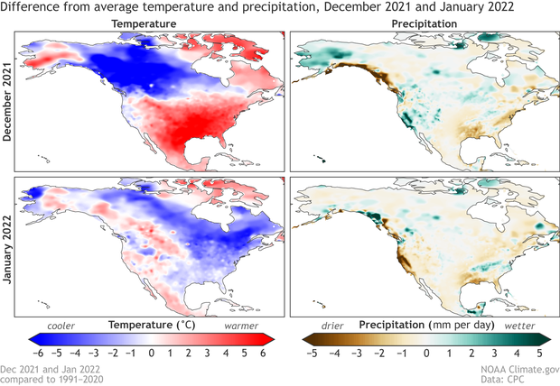 Temperature (left maps) and precipitation (right maps) difference from the 1991ā2020 average during December 2021 (top row) and January 2022 (bottom row). Maps by climate.gov from CPC Global Daily Temperature data and CPC Global Daily Precipitation data.