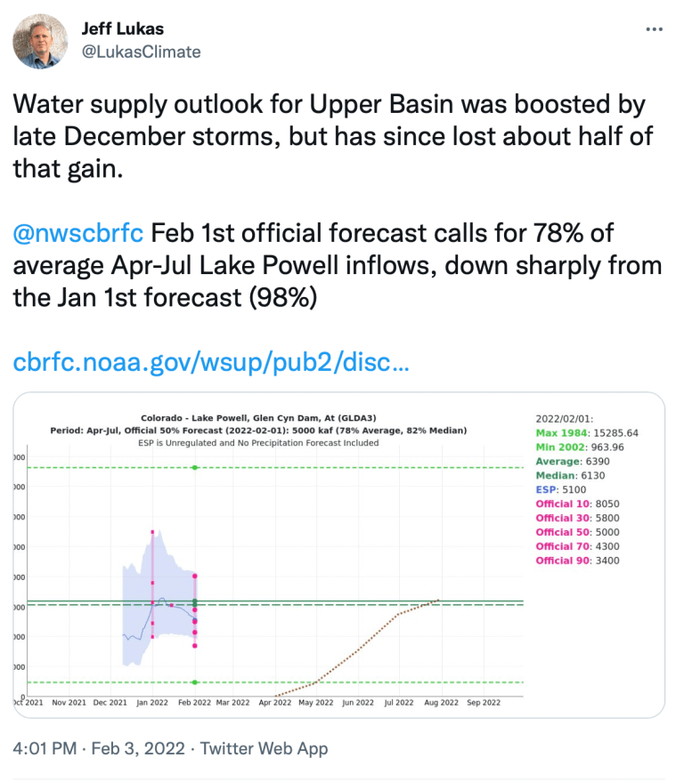 The majority of the mountain snows that feed the Colorado River fall in the Upper Basin. Although recent conditions have improved slightly, with snowpack reaching average or above average levels in the western half of Colorado, climate scientists say the runoff forecast is not matching up and attribute lower forecasts to the impact of badly depleted soil moisture caused by prolonged drought.