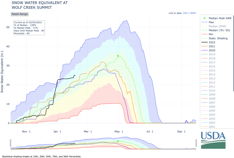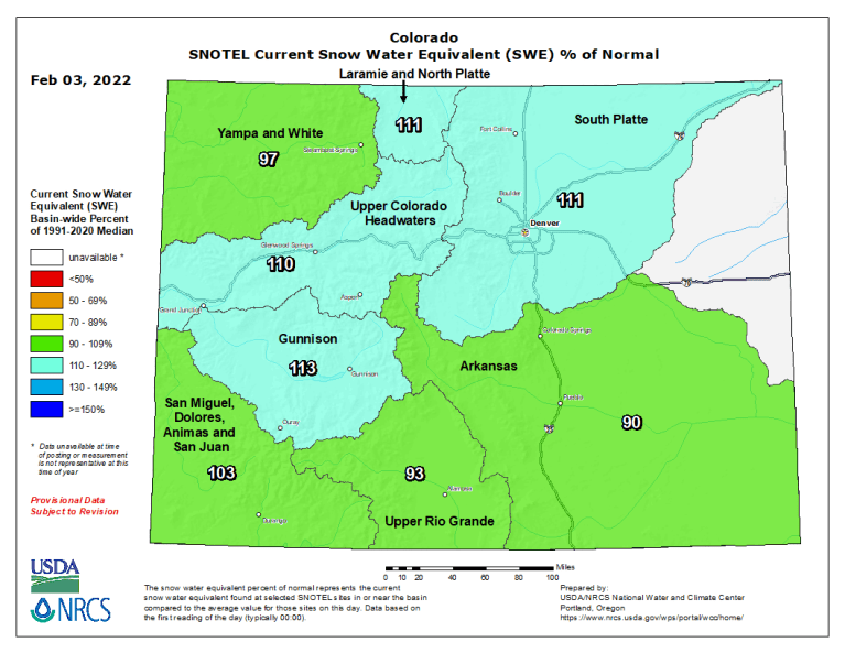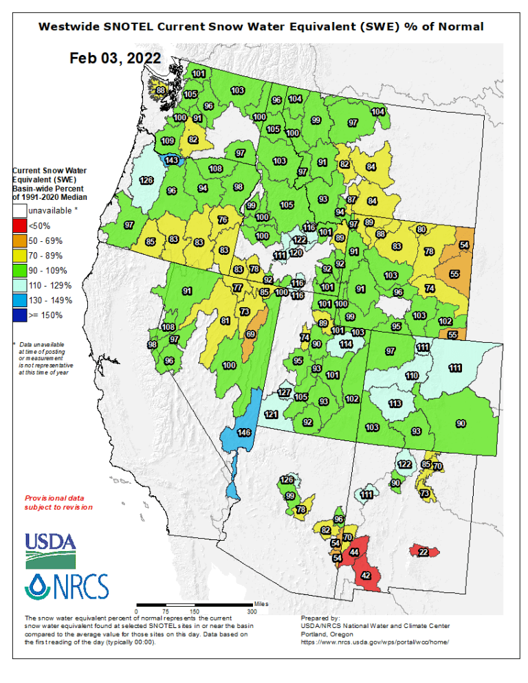Westwide SNOTEL basin-filled map February 3, 2022 via the NRCS.